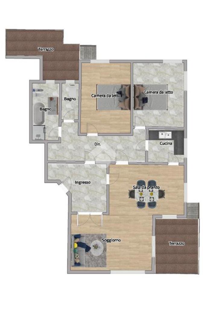 Dall’ingresso si accede alla luminosa e spaziosa zona giorno, composta dal soggiorno e dalla sala da pranzo con accesso diretto al terrazzo, oltre alla cucina. Un comodo disimpegno conduce alla zona notte dove troviamo due camere da letto e due bagni: il primo con vasca ed il secondo più ampio con vasca e doccia, e con accesso diretto ad un secondo terrazzo. Entrambi i terrazzi permettono di accedere direttamente al giardino di proprietà.